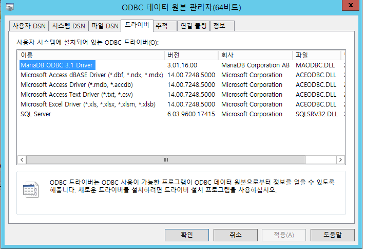 위 파일 설치 후 윈도우 서버 에서 odbc 데이터 원본 관리자 창 열고 드라이버 탭 확인하면 아래와 같이 MariaDB ODBC 3.1 Driver 확인 됨